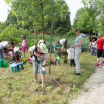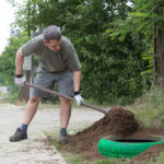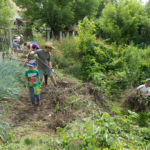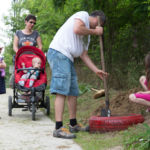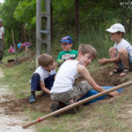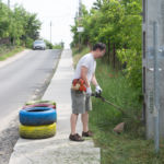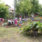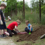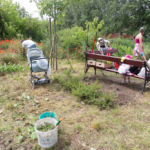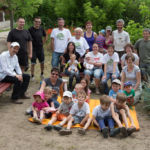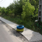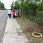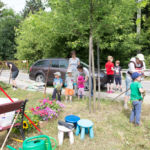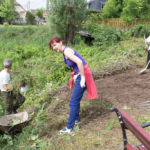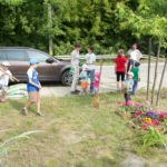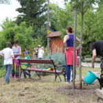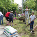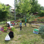 A rézsűbe a fiúk beásták a lefestett gumikat (kettő még nem volt kész azt ott festettük 🙂 ) a tetejére virágföld jött és bele a virágok. A kapcsolat parkot rendeztük amennyire csak tudtuk ki írtottunk mindent amit lehetett.